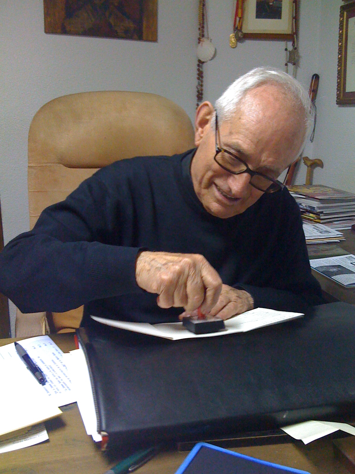 I left the Prado with enough time to once again traverse Calle Mayor and get to the Church of Santiago before evening prayers were over. I tiptoed in at the end(?) and listened in dumb fascination to the Spanish catholic service (neither of which I am fluent in). After the wine & cookies were consumed, I thought that the priest might come down the aisle and wish everyone farewell, as my vague protestant memories recollect, and I would then ask him for a sello (stamp). But no, the sneaky little man hightailed it off the stage, leaving the parishioners to blow out the candles! The 4 little old ladies scrammed with their shopping, so I accosted the last person left in the place: a young priest, it so happened. He only spoke Italian and Spanish but “Camino sello” turns out to be international, so he ushered me into the back office and introduced me as a peregrina. The Father couldn’t have been more thrilled to meet me and set off on a long story of pilgrims and stars and finding his way (at least that’s what I like to think he was saying) and cheerfully stamped my credential. I’m now official! (see the walking staffs and scallop shells in the background?)