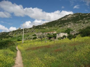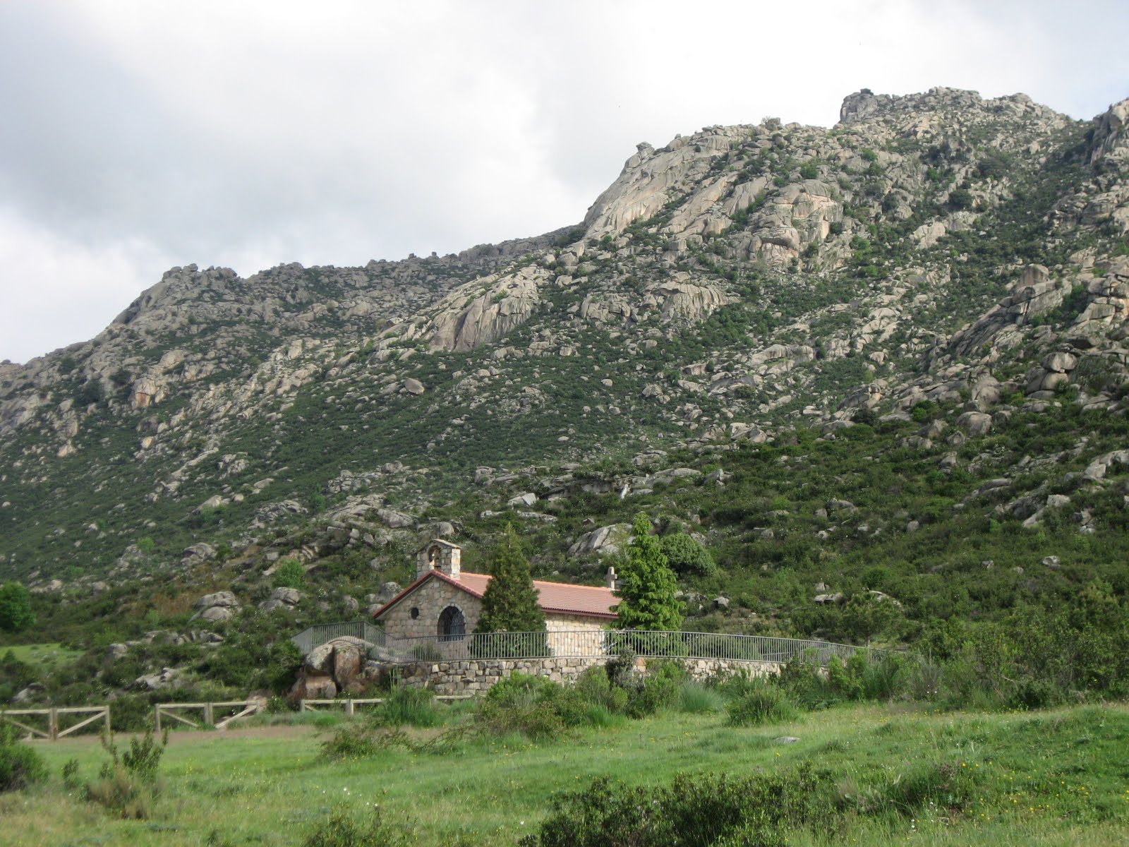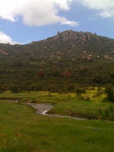 Another gorgeous day walking. Rained during night but was perfect walking weather. I walked alongside a huge hill today, full of Flintstone-type boulders, much like Joshua Tree National Park (well, ’twas much greener!) That’s the pic above, I’ll find an Internet cafe in Segovia to add other photos to this and previous posts from my camera).
