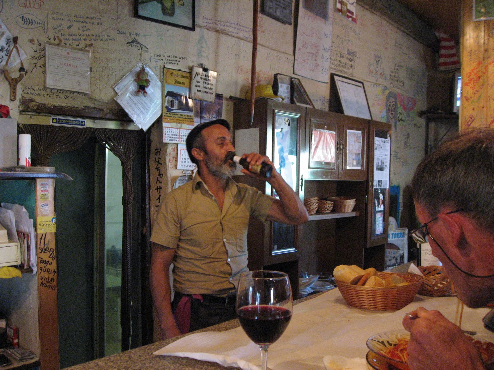It´s 8:30pm and I´m in one of the 3 tiny bars in town. We had our usual 3-course lunch at 3pm, so dinner is out of the question, but I felt that an evening glass of vino tinto was in order. Drinks always come with a little ´pincho´- tiny taster of something. In my case, a slice of nice cheese and ham. I stole a piece of bread from the 2 French pilgrims at the bar beside me, and now we are discussing the weather with the barman in 3 languages, comparing reality with the trusted almanac he keeps behind the bar.