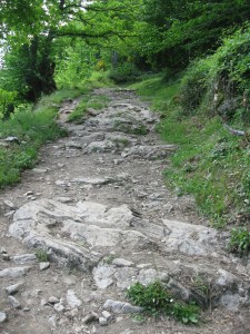 I made sure I had an early start – 6:20am, for the day’s adventures. I crossed the bridge out of town, found my route deviation, and “whack” right in the face was a road so steep I could have blown my nose on it. As much as I like hills, this was suicide. Luckily, it only lasted a few 100′ feet till it smoothed out to a nose-bleed climb, and I was immediately looking far below on the poor pilgrims slogging along the road route.