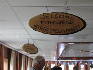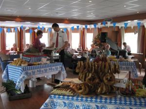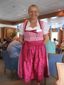 Buffet lunch of German tasties: various sausages, sauerkraut, roast pig, pretzels, potato salad, mustards, etc. The staff got dressed up in leiderhosen and barmaid dresses, and the piano man pounded away at rollicking tunes like Roll Out The Barrel. Good fun. The crew really do a good job of entertaining us. Hard on such a small ship (and full! 107 pax out of possible 120), but there’s been talks, poetry contests, afternoon teas, German dancing, etc.