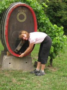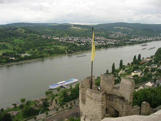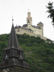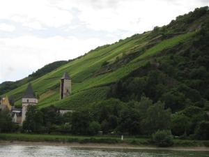 By the time we recovered from our lecture, I mean breakfast, we’d docked in Braubach and the ship had a quick organized trip up to see the little castle perched just above town. It’s the only castle in the region that’s been continuously occupied, therefore never ruined nor abandoned, though it had been taken over a few times. It dates from the 1200’s, so it’s pretty cool to visit. The steps into the castle were extremely rough hewn, tortured even, from the rock base; the kitchen was outfitted in medievel period furnishings and had a fireplace large to roast an ox; we saw the knights’ dining room that included a toilet, an little room jutting out from the building, literally an arm’s reach away from the table (and the lock was on the outside of the door, in case their enemies decided to clamber up the slimy wall and invade the castle from poop room); and a kick-ass view.