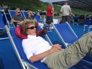 After lunch thunderstorms and driving rain kept us inside staring out at the gloomy scenery. The middle Rhine is supposed to be the most beautiful section of our trip but the weather is making this challenging to believe. The cruise director valiantly broadcasts each important castle and town, and we dutifully turn our heads to look, but enthusiasm for sightseeing is lukewarm this afternoon. Gradually the skies dry, and one by one the passengers creep up to the sundeck to test the fresh air and presto! 5pm = Happy Hour, sun out and mom bathing on lounge chair. Fingers crossed this will be the end of it…
