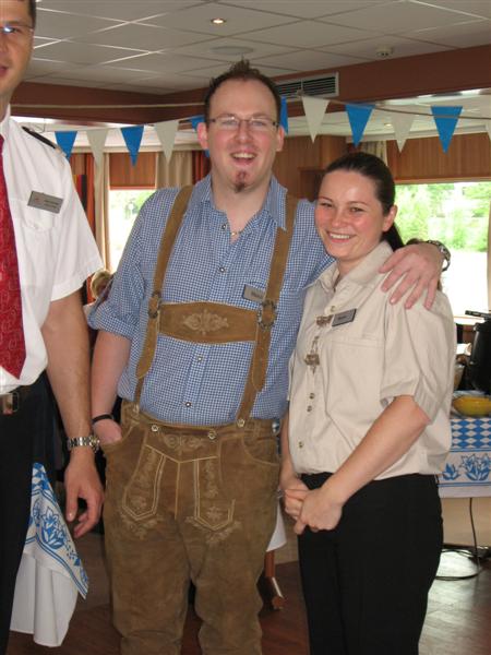 Buffet lunch of German tasties: various sausages, sauerkraut, roast pig, pretzels, potato salad, mustards, etc. The staff got dressed up in leiderhosen and barmaid dresses, and the piano man pounded away at rollicking tunes like Roll Out The Barrel. Good fun. The crew really do a good job of entertaining us. Hard on such a small ship (and full! 107 pax out of possible 120), but there’s been talks, poetry contests, afternoon teas, German dancing, etc.