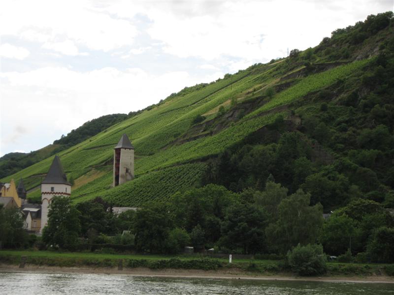 After lunch thunderstorms and driving rain kept us inside staring out at the gloomy scenery. The middle Rhine is supposed to be the most beautiful section of our trip but the weather is making this challenging to believe. The cruise director valiantly broadcasts each important castle and town, and we dutifully turn our heads to look, but enthusiasm for sightseeing is lukewarm this afternoon. Gradually the skies dry, and one by one the passengers creep up to the sundeck to test the fresh air and presto! 5pm = Happy Hour, sun out and mom bathing on lounge chair. Fingers crossed this will be the end of it…