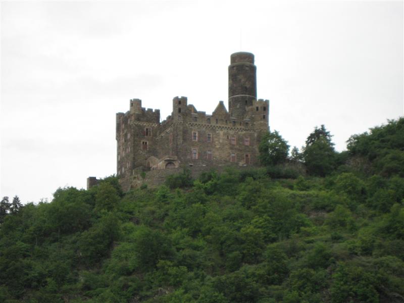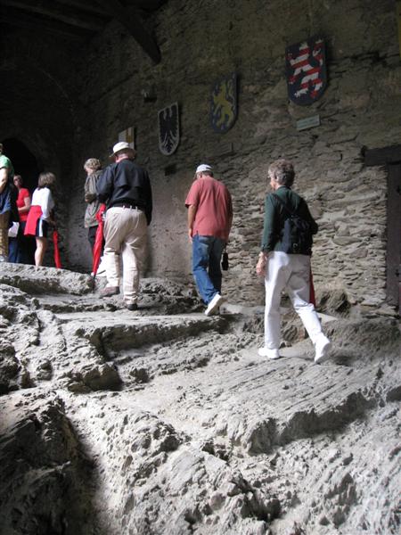 By the time we recovered from our lecture, I mean breakfast, we’d docked in Braubach and the ship had a quick organized trip up to see the little castle perched just above town. It’s the only castle in the region that’s been continuously occupied, therefore never ruined nor abandoned, though it had been taken over a few times. It dates from the 1200’s, so it’s pretty cool to visit. The steps into the castle were extremely rough hewn, tortured even, from the rock base; the kitchen was outfitted in medievel period furnishings and had a fireplace large to roast an ox; we saw the knights’ dining room that included a toilet, an little room jutting out from the building, literally an arm’s reach away from the table (and the lock was on the outside of the door, in case their enemies decided to clamber up the slimy wall and invade the castle from poop room); and a kick-ass view.