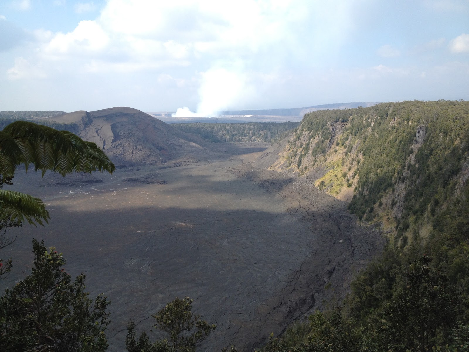 We hiked the Kilauea Iki Trail, a 4-mile trek along the rim of a crater, descending 400′ through a rain forest of Jurassic Park-style tree ferns, to stumble across the hardened moonscape of the caldera to the other side and up again to the top