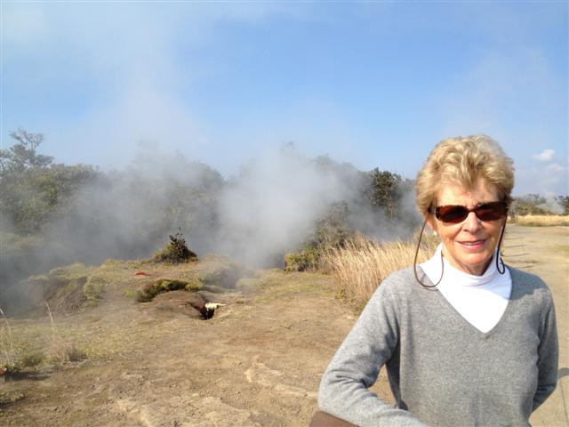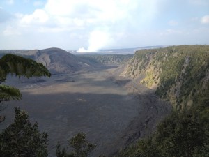 We had hoped to return to the National Park after dinner for a nighttime viewing of the Halema’uma’u Crater but the mist was so thick we could barely see beyond our car’s headlights, so off to bed it was. Then I woke up at 1am, and was completely awake. Staring at the ceiling for a while I realized that the rain had stopped and it was actually quite clear outside. Mom woke up too and after a few minutes of thought she agreed to get up and sneak out for a midnight peek at the Crater. The Park is open 24/7 but the entrance gate was unmanned at that time and so we ‘proceeded’ as per the sign in the window. It was only after we arrived at the Jaggar Museum at the Crater’s viewpoint did we find out cars weren’t allowed in after 8pm – oops! But the show was magnificent! What was merely a plume of smoke during the day was transformed into a rich red glowing tower of steam as the molten lava, hidden by the crater’s edge, lit up in the darkness of night. We could see it quite clearly but unfortunately my camera couldn’t capture it well at all