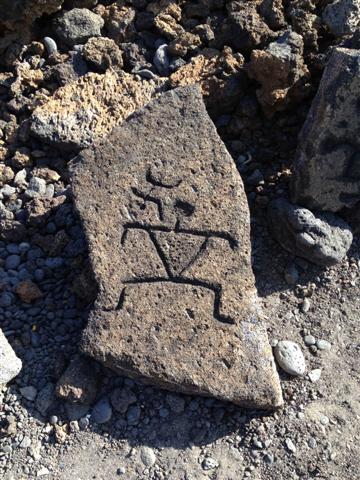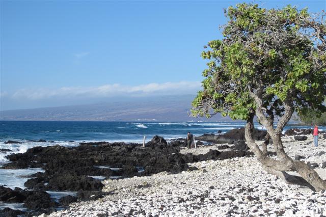 For our last day on the Big Island we drove west, past Ka Lae, the southern most point in America and all the signs: Southern-most Bakery, Southern-most Bar, Southern-most gas station, etc., and around and north up the Kona coast to the Kohala region. This is where the Ironman Triathlon is held and the highway is gentle, superwide and links huge swathes of desolate lava fields with super lush pockets of coastal resorts. We stopped at the Mauna Lani resort to walk the Malama Petrogylph Trail – a .5 mile walk through dense, twisted, stunted trees to a flat boulder field covered with 1000’s of rock carvings. Not much is known about the petrogylphs or why they were carved but it was quite a sight to see