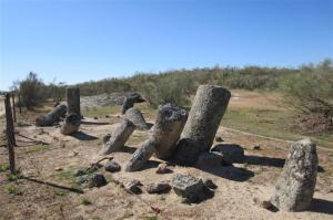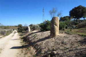The scenery improved with the temperature: from the blah-thank-goodness-its-dark roadway, to quite striking: barren moor-like grazing fields populated with cows, sheep, huge boulders and the occasional farm building. The dry stone hedgerows that separated the farms also lined my country dirt road but it was accented with by raggedy bushes of lavender and white & yellow broom. Then, as I came over a rise, it magically changed to sparse scrubby forest with more of these lichen-covered boulders. I also walked past 2 clusters of roman miliarios – large ancient stone columns about 4-5′ high that marked off distance for those ancient marching soldiers, as well as a short section where the actual paving stones of the old roman road were still visible (the Via Plata actually dates back to the 3-4th C., the pilgrimage route just followed the same way).