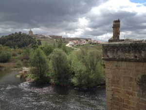 Well, in the end we didn’t exactly save kilometers but we avoided adding any extra as further down the Camino was blocked and a long detour added. But this we did not find out till the end of the day when we met someone who walked straight on, and by mid-morning we were cursing the helpful pilgrim as after Riolobso there was nothing but miles and miles of road walking! Anna and I (walking separately) each decided not to stop in the walled hilltop town of Galisteo, pictured above, but continue on to Carcaboso to ‘get ahead’, 16kms of road in total! Luckily it was a cool cloudy day…