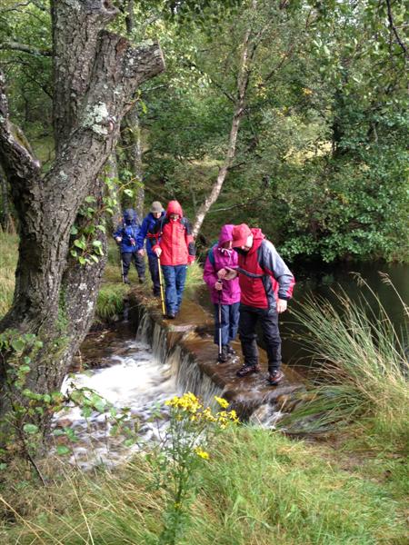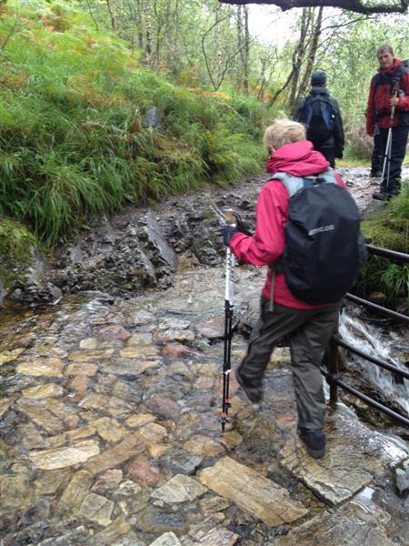 The next two days were even soggier than Day 1. We got wet from above and wet from below. This day we chose a route for the views: looking down over Loch Leven and then over and into the glen behind; along a river and a bit of the Highland Way before ending in Linlochleven. The initial ascent was perfect as the rain held off for our climb and some picture-taking but it soon fell in constant sheets causing the much of the trail to be boggy & muddy, with streams of water running freely down the path. All eyes were focused solely on obtaining sure footing on higher ground; and, unless we were taking a break there were few opportunities to take in much of the views.