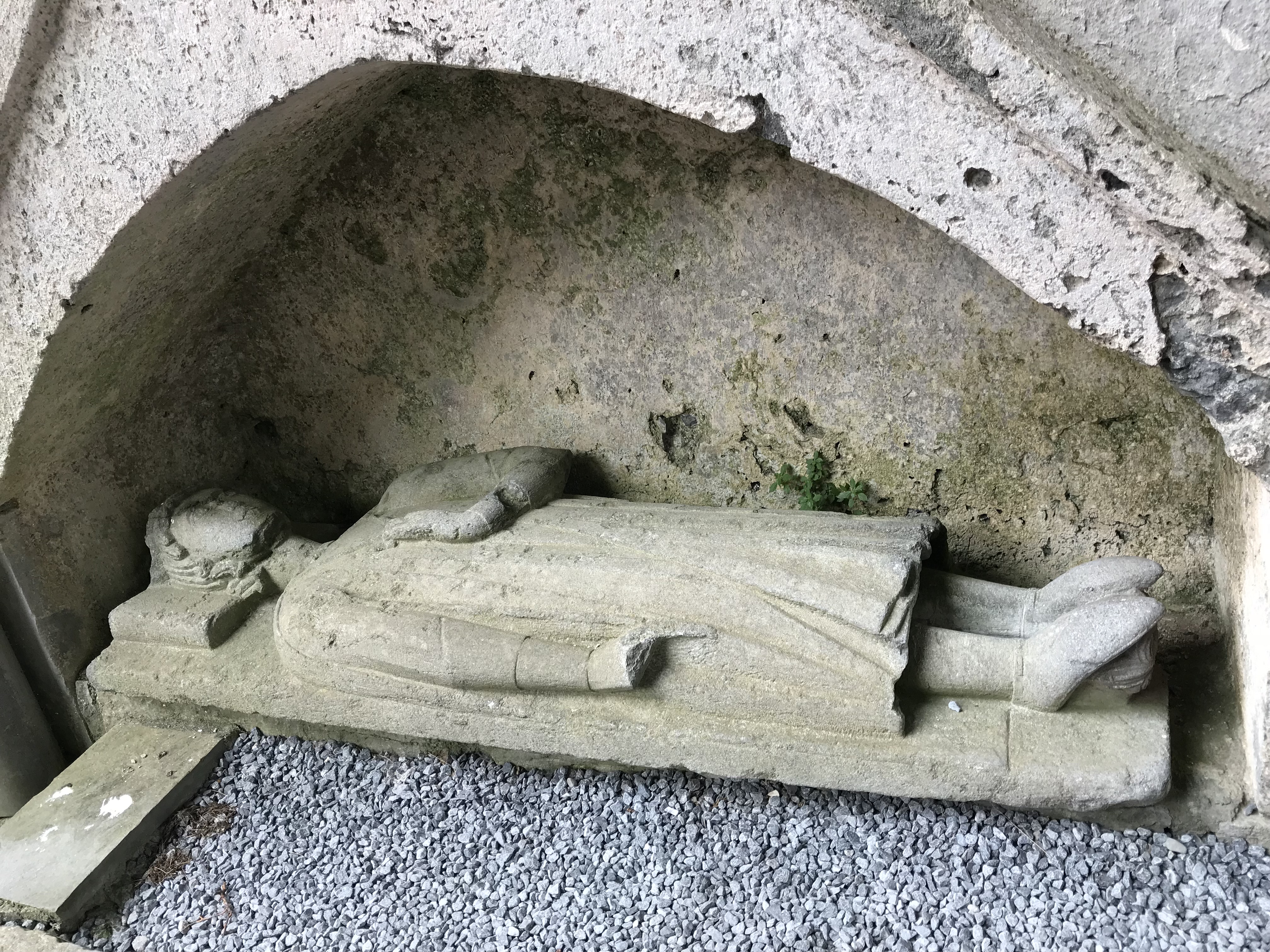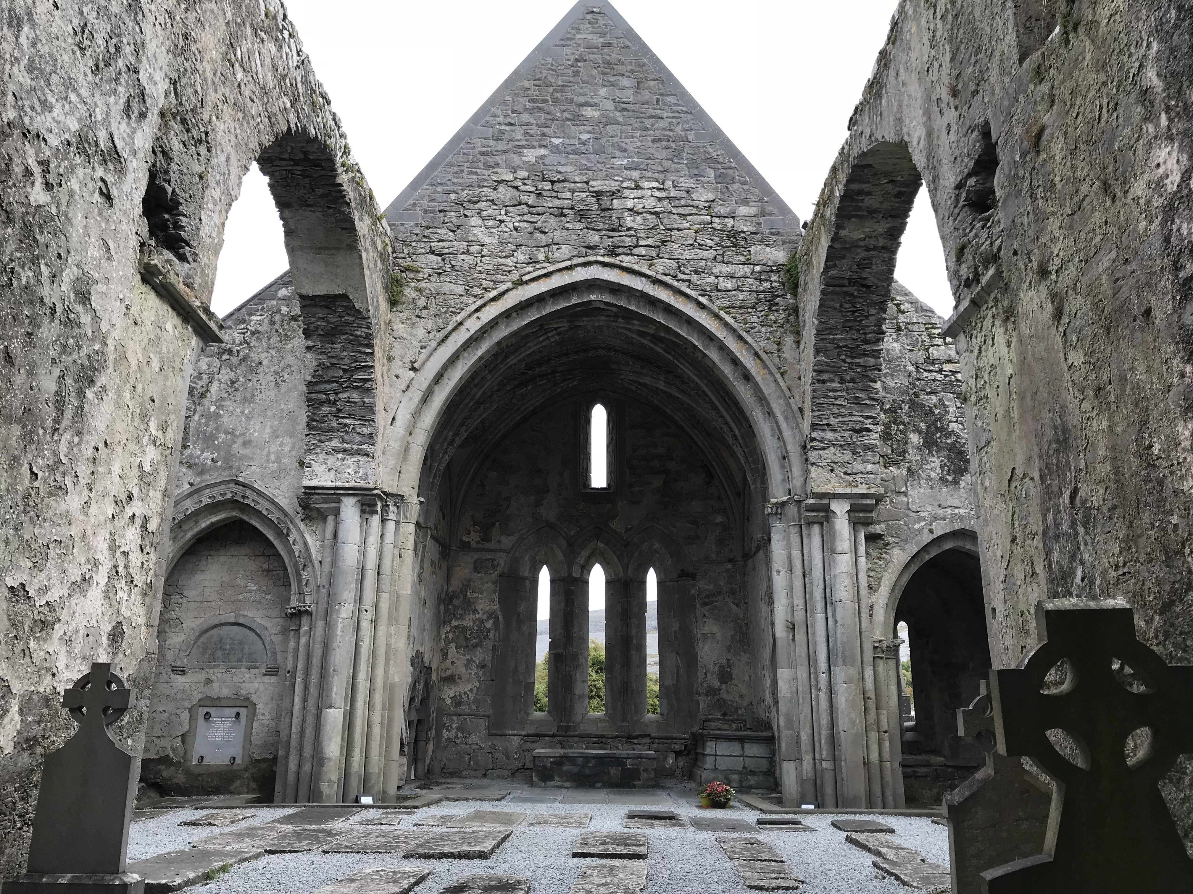 Then it was north and down off the Burren and thru Ballyvaughan to Corcomroe Abbey, which was dedicated to ‘Our Lady of the Fertile Rock’ by the Cistercian monks in 1194. Its a superb place to admire some elaborate carvings and beautiful masonry. Surprisingly, a tomb effigy is still there. Again, the locals have the odd practice of burying themselves in the old church ruins. It’s rather disconcerting to see modern tombstones amongst the old.