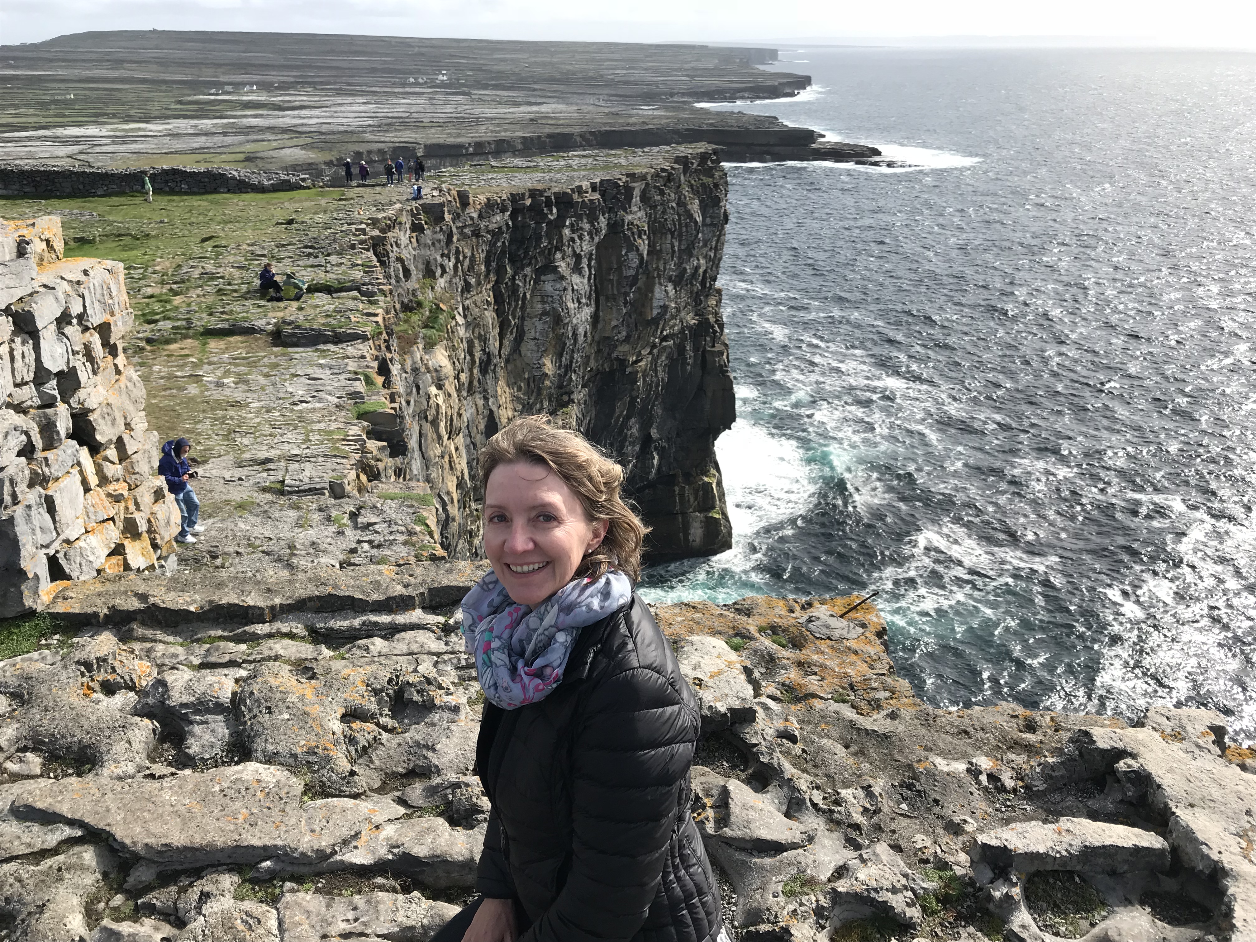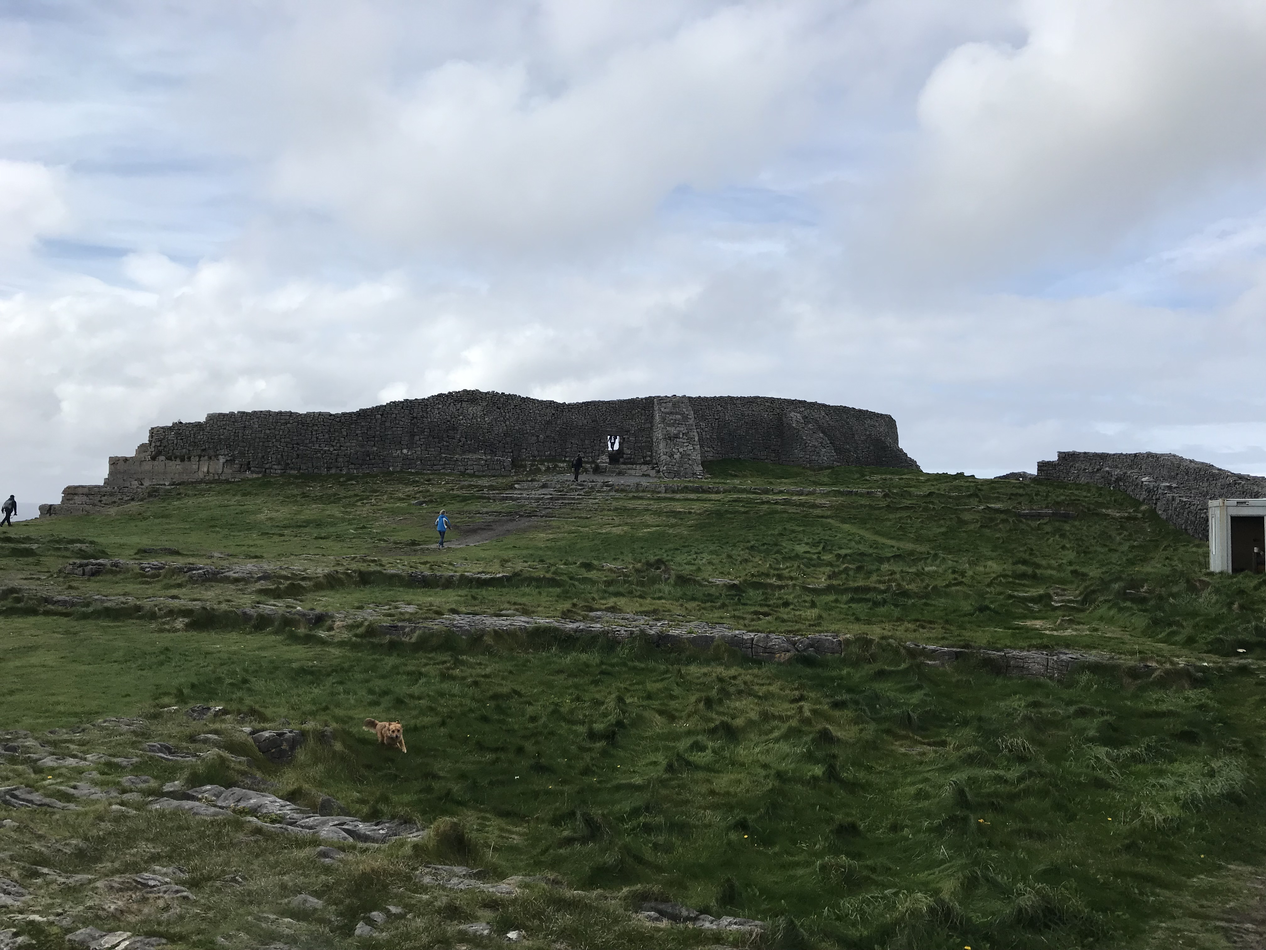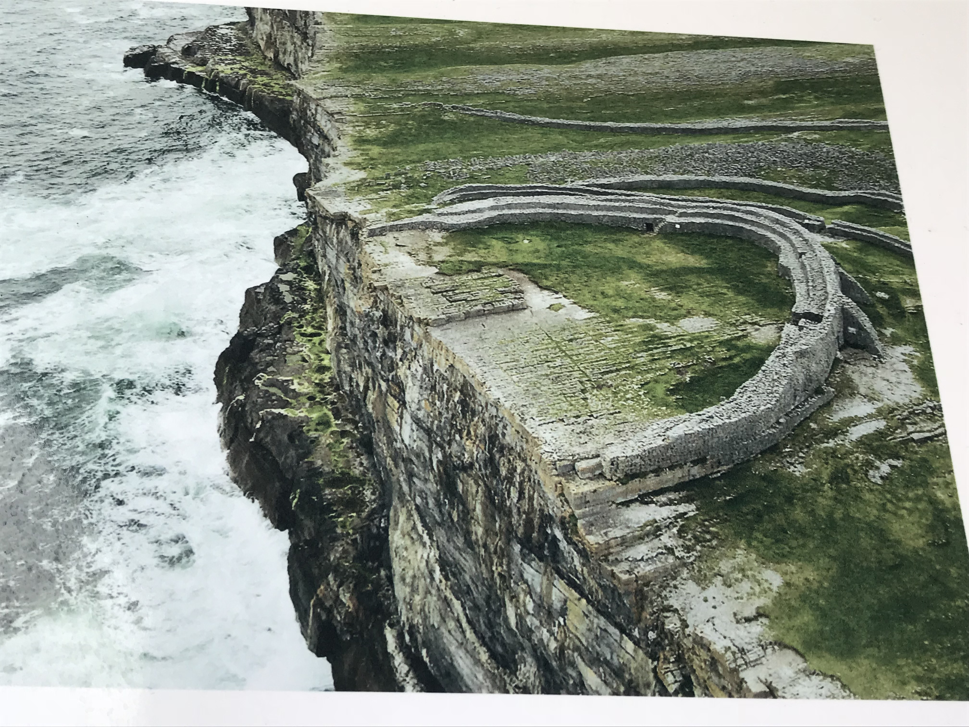 Our highlight was stopping at Dun Aengus, a spectacular stone fort sited high up on the edge of a cliff, with views to rival those at Moher. It’s considered one of the most important pre-historic sites in Western Europe; and is constructed as a set of concentric half-rings, as shown below in a photograph I took of an info placard. Looking back over the island one can see how flat and barren it is, all except the eastern edge which must be the side more protected from the constant wind.