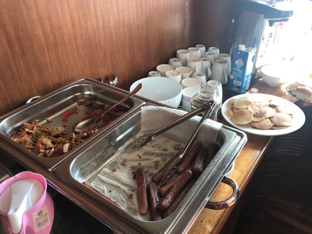 A buffet breakfast awaited our return. Not grand – dollar pancakes, mystery meat hotdogs, toast, eggs, and sliced fruit but definitely welcome. As I understand, liveaboards are all: “Dive”, “Eat” and “Repeat”.