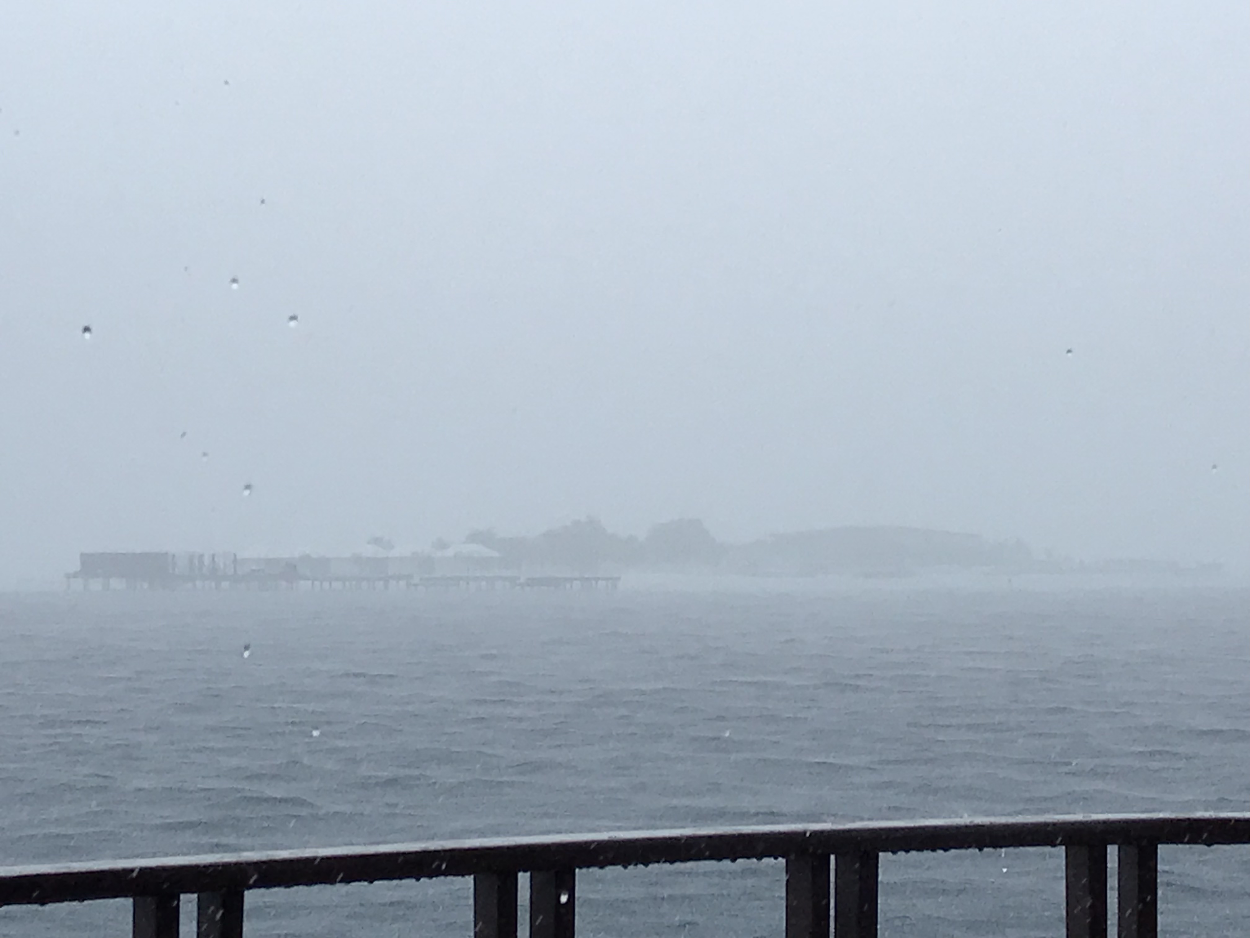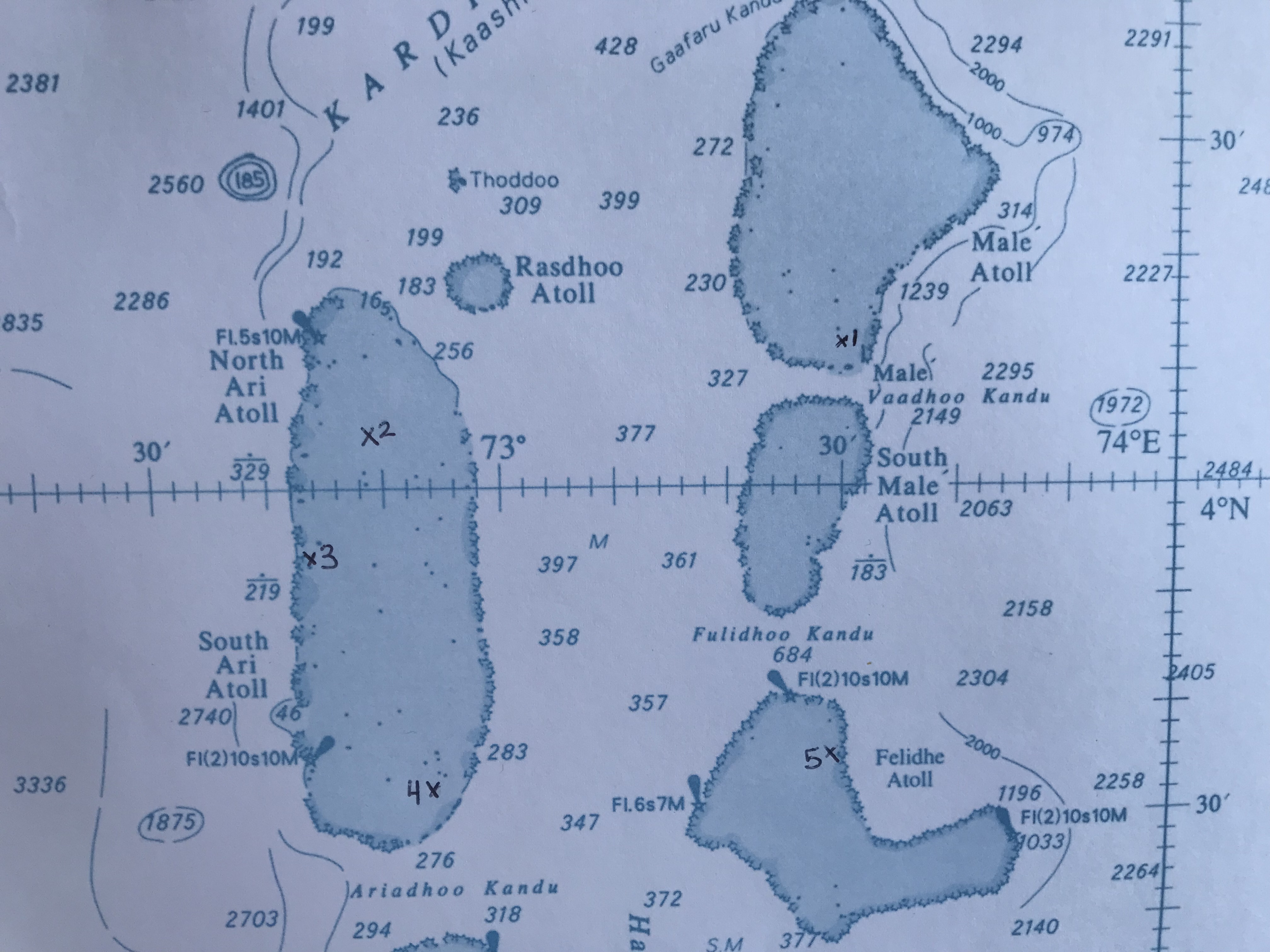 The captain started up the engines as soon as we got back onboard the Theia. It’s a couple hours journey across open water to the Vaavu Atoll. It was a pleasant first hour or so, warm but not hot with the cloud cover. The rain came slowly but surely until it fell steadily for the longest time. We entertained ourselves, lounging on the settees outside our cabins, watching the accumulating water flow across the decks, overwhelming the deck drains. The poor crew in the open-sided dhoni had to suffer the deluge whilst chugging along in our wake.