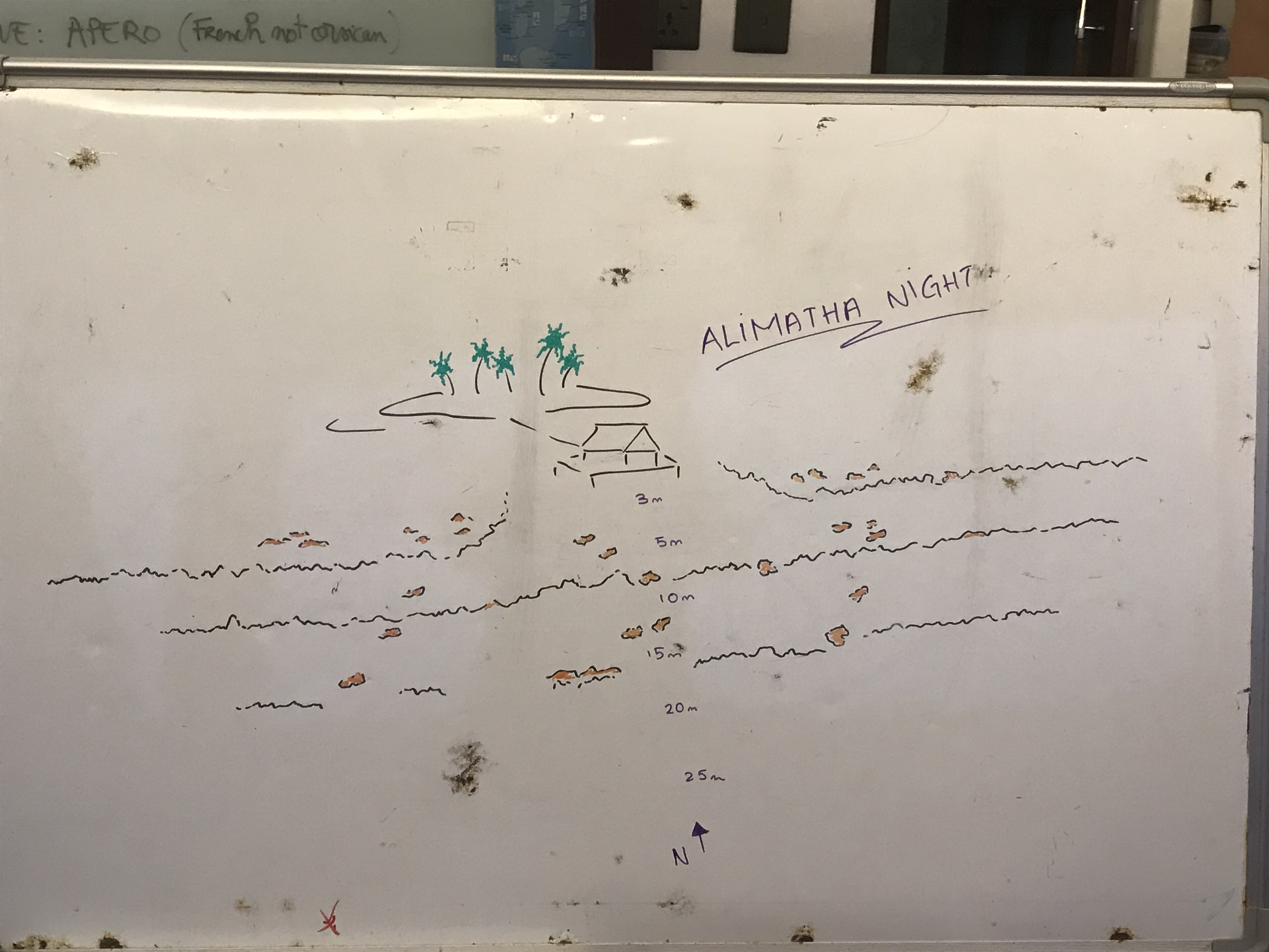 At 6p the bell rang for our briefing- we’re going for it! We descended to the bottom at 47’ and we noticed a couple of other groups already there, forming small circles of light from their underwater flashlights. Everyone staked out a patch of sand, set their reef hooks as the current was quite strong, and sat back and waited. Almost immediately 2 nurse sharks and a stingray came sniffing, the ray skimming right over our DM’s shoulder to smell if he had any food on him. From then on we just kept looking left, right, up and backwards, almost always seeing a shark or ray coming or going. There were so many flashlights that I was able to leave mine at my side and just look, finding it easier to spot them when backlit versus shining my light randomly, lighting up plankton instead. Sometimes there’d be a group of 3-4 sharks circling slightly above us and one would break free to swim amongst us but they were very gentle and very polite. Just casually passing by in case we had a handout for them. The largest, which I thought was pregnant but my guide told me was just fat, was approximately 6-7’ so they weren’t humongous and not scary. It was fun! Areesh believes that only the Maldives and the Bahamas offer such experience.