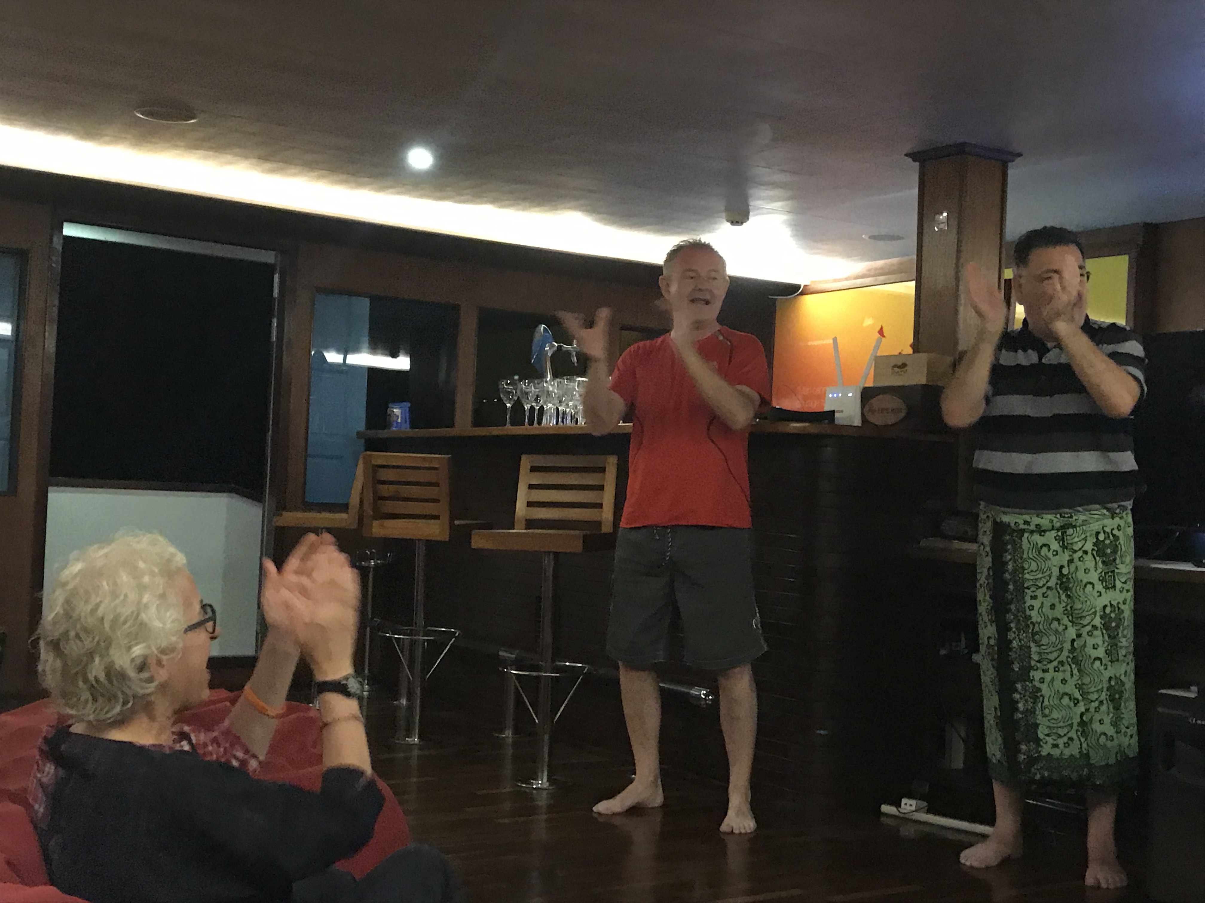 After diving and before dinner, it was the French (not Corsicans) who treated everyone to an aperitif. White wine, of course. But before we could drink we had to partake in a song (traditional? regional? patriotic? Je ne sais quoi.). But it involved waving of the hands, clapping and a repetition of “Bonne Bourguignon, Bonne Bourguignon”. I wonder who’s turn it will be tonight, we’re out of dive groups and there’s just individual countries left.