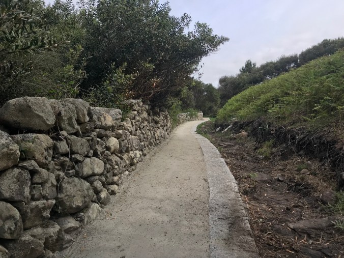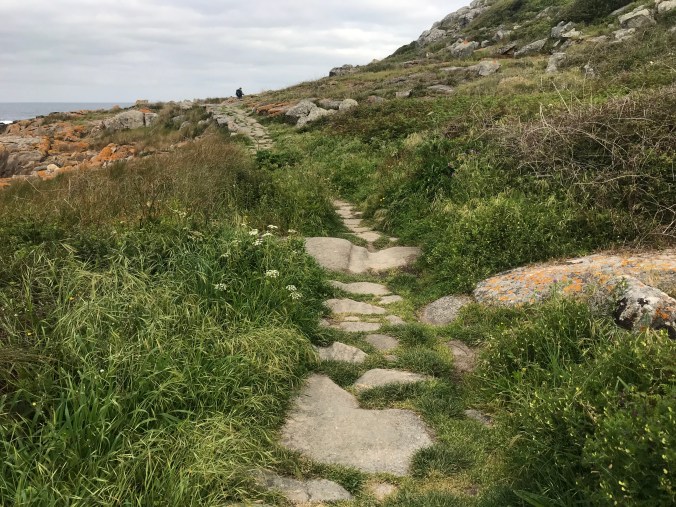 I left just after 8:30am in overcast skies. The forecast for the next few days does not look good so I’ll have to make the most of today. I circle around the inner harbor then leave town on a worn down rock path with cart ruts dating back to ?