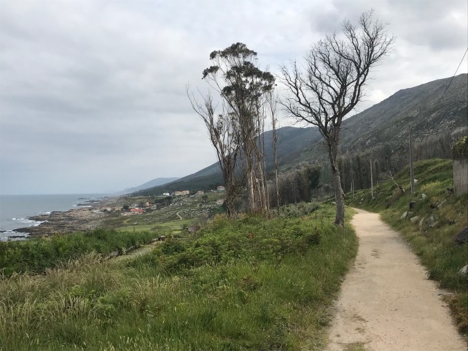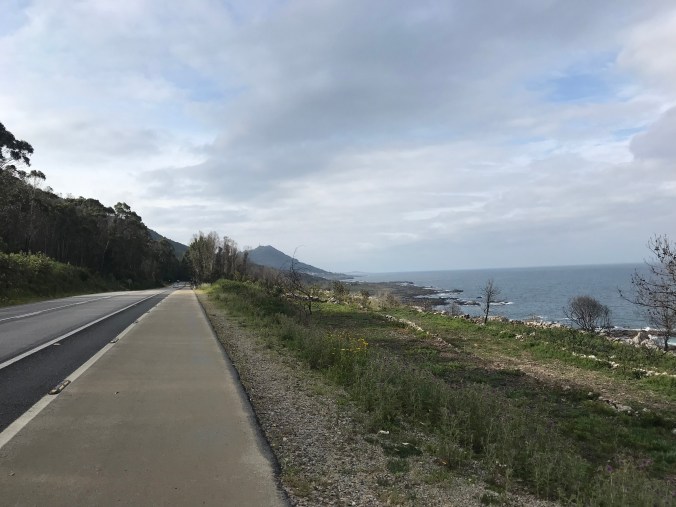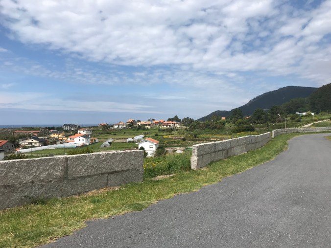 Far too soon we were directed up above the coast to a wide paved shoulder of a highway. A garrulous older Spanish biker stopped and effectively said we must stop and visit his cafe! The couple from New Jersey that I was walking with (also customers of last night’s hotel) agreed we must!