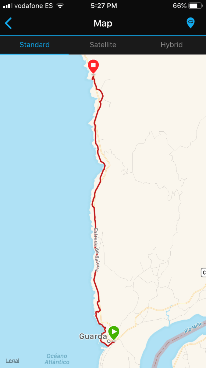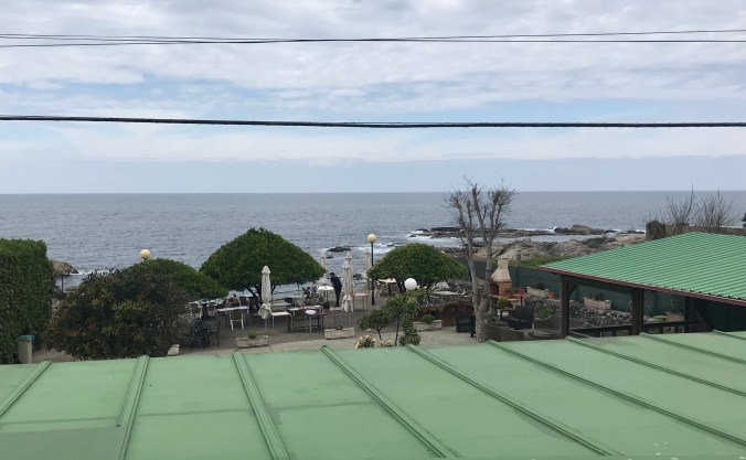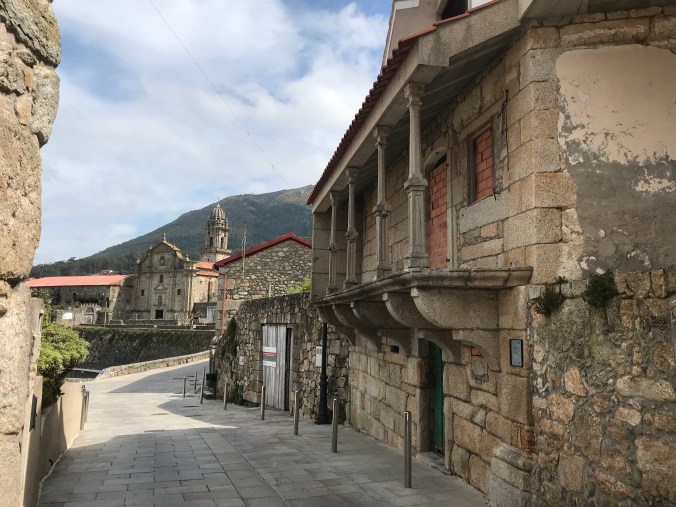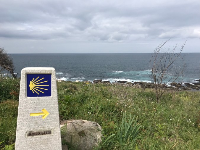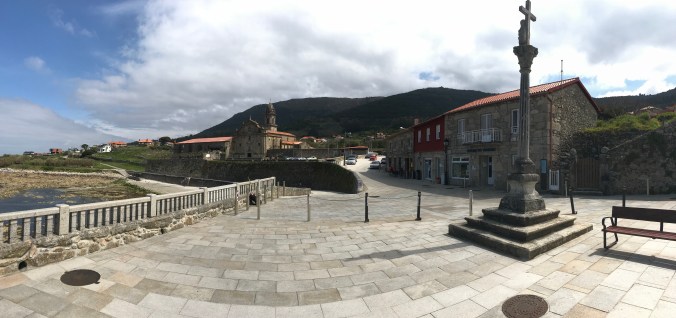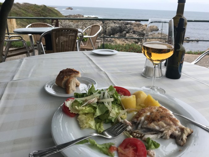1:30 pm and 17.6 kms I was back to the highway, not a particularly attractive part either. My body was getting a bit tired and I was looking forward to finishing the last 2.5 kms so I could put my pack down and have some lunch. Then I walked by a restaurant advertising a Pilgrim’s Menu with a lovely terrace overlooking the sea. “No, finish the walk then eat”, I thought. “But what a pretty view”, I then thought. “No”, as I continued on, “you don’t want to walk on a full stomach”. Well, apparently I did because I turned around and was welcomed with a fine tablecloth and the best seat in the house. And who was already here? The NJ couple!