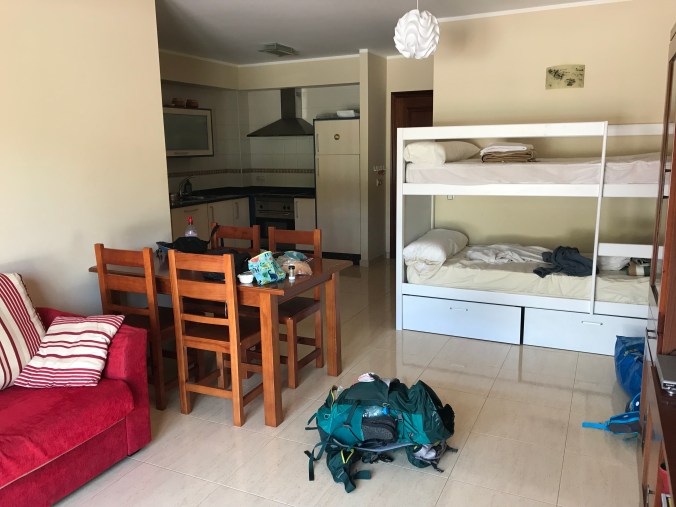 Oh, no, that’s not my pack dropped in the middle of the floor, it’s my bottom bunk mate’s. My stuff is nicely tucked away there in the corner. There’s a bar next door so after my shower/laundry I’ll resuscitate myself with a glass of vino blanco and write this blog!