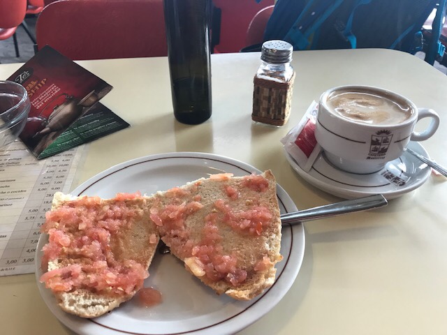13 kms I reached Baiona and my first open cafe. I only had a few minutes break at 8 kms on a hard rest area bench so I was grateful to stop at the first cafeteria I saw. Maggie, a fellow peregrina whose blog I follow always orders tostada con tomate and for some reason today I did to. It wasn’t especially great but I didn’t want “sweet” for breakfast.