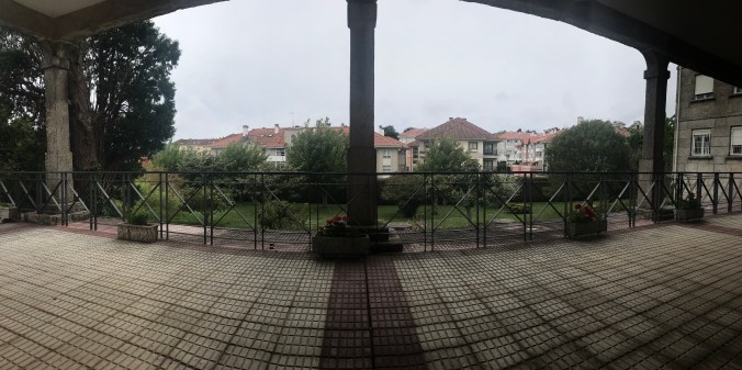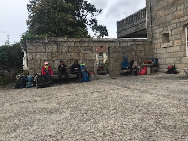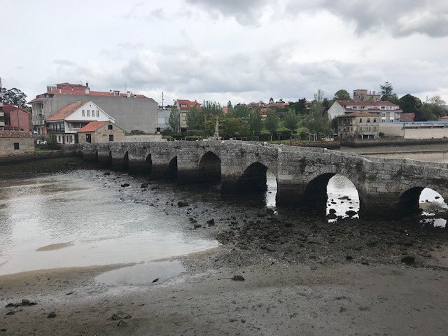 By almost 18 kms I crossed an old 13th C. bridge into Ramallosa and arrived at the albergue Pazo Pias about 3 hours too early to check in. Nearby was a large grocery store so I went to get some groceries – either for lunch or dinner, will have to see how day goes. Upon my return to the albergue I met the young girl from the Netherlands whom I shared bunks with last night. There’s another couple waiting as well. I’m not sure how large the albergue is but I’ve no worries on getting a bed. Often, in cases like this, you just line up your backpacks in order of arrival to “save” your place in line. I’ve just left mine on a bench and gone inside the inner courtyard to be out of the breeze and to enjoy the garden.