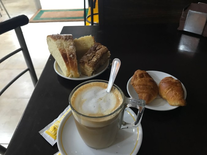 After 4 miles the way passed through the town of Arcade. I’m on the lookout for my first coffee stop. The Camino was being too efficient at keeping us off the main drag so I took a detour away from the arrows and followed my nose to a little pastelería for my coffee. The hostess was just coming out of the kitchen with a tray of mini croissants so I asked for 2 of those and look what I was served! I still got the complimentary cakes as well. Luckily I had a spare ziplock to take the leftovers for later. On a sugar and caffeine high I’m ready to resume walking!