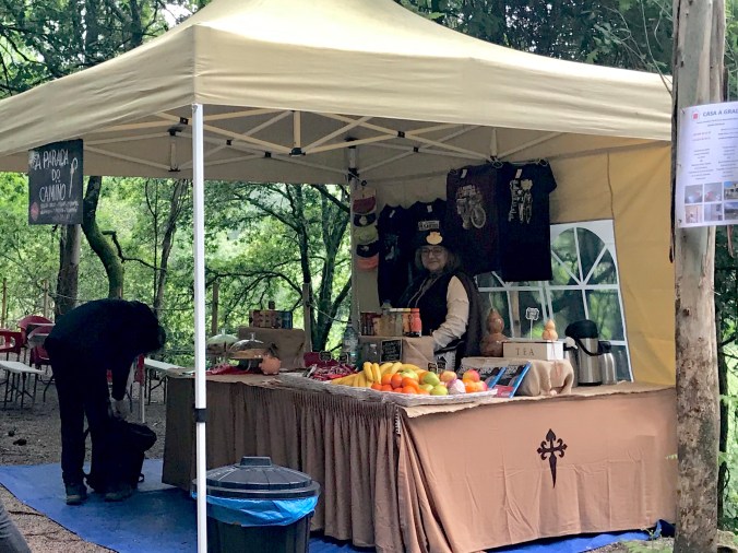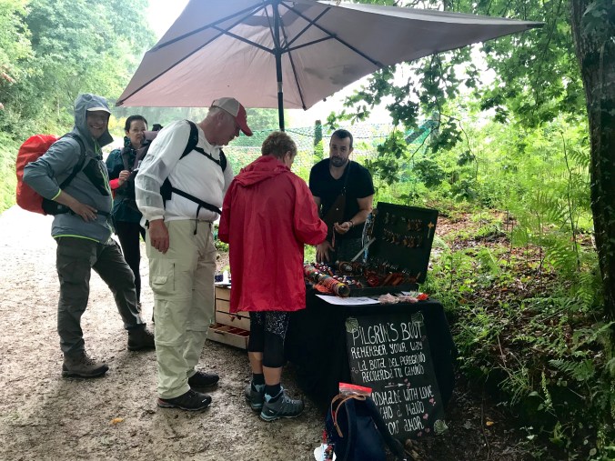 Some more entrepreneurs, 3 so far today, have set up covered tables selling fruit, snacks, pilgrim souvenirs, even hand-tooled leather wallets, keychains, etc., profiting off the pilgrim trade. Probably much as they did a 1000 years ago!