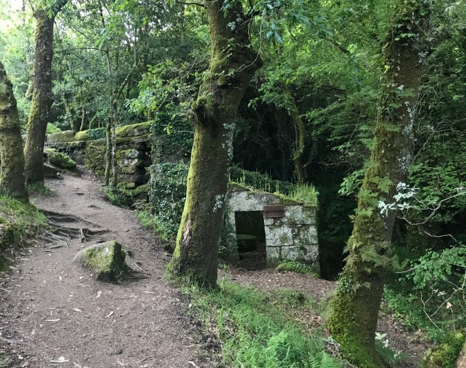 I didn’t hit the trail till 8 am but the sun was just then breaking over hill behind the Pousada, let alone penetrating through the dense tree canopy of the Ruta. Immediately there’s a little waterfall, then a ruin, then another waterfall. I can’t stop taking pictures and am proceeding at a snails pace. It’s so dark and mysterious and compelling. I have it all to myself as other pilgrims have mistakenly taken a different way that remains above the little gorge while I’m right at the water’s edge. Unfortunately I don’t know the history of these mills, I’d be happy to know just from when they date.