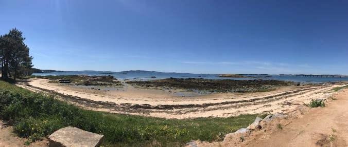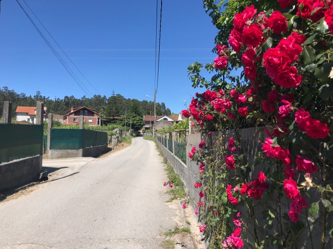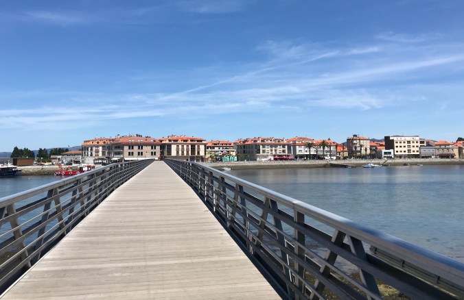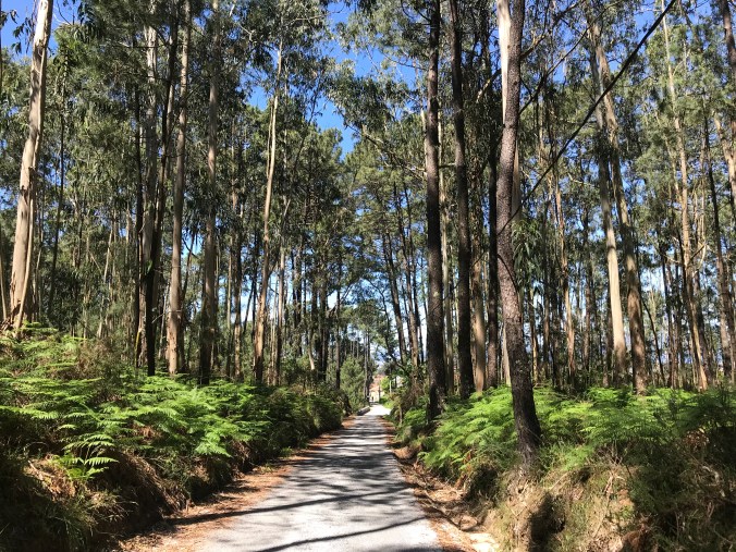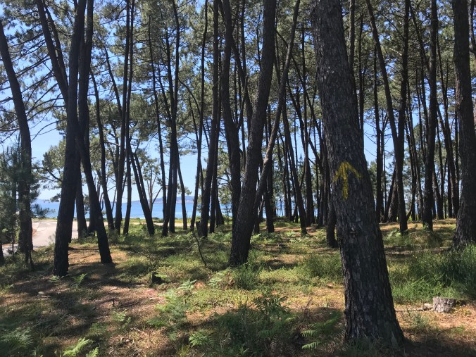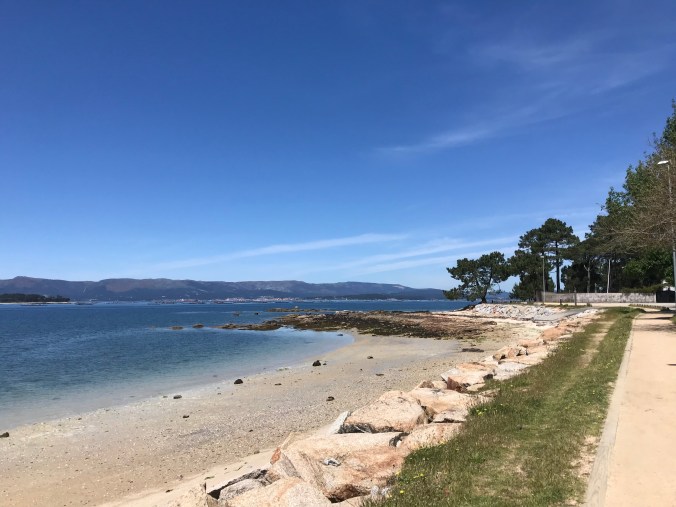 At 14.7 kms I had my first food of the day: a Magnum ice cream bar in the company of other wilting pilgrims before heading back to the Camino which unfortunately was now on a sidewalk heading uphill into a small village. Then it was backroads up and over a hill of eucalyptus trees then back down to miles of residential walking until at 22kms a little respite of pine forest broke open to display the shining sea beyond.