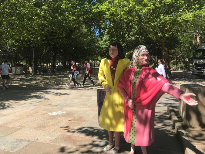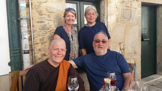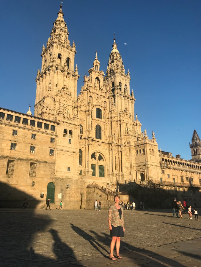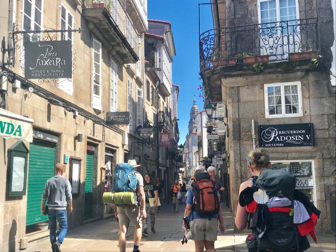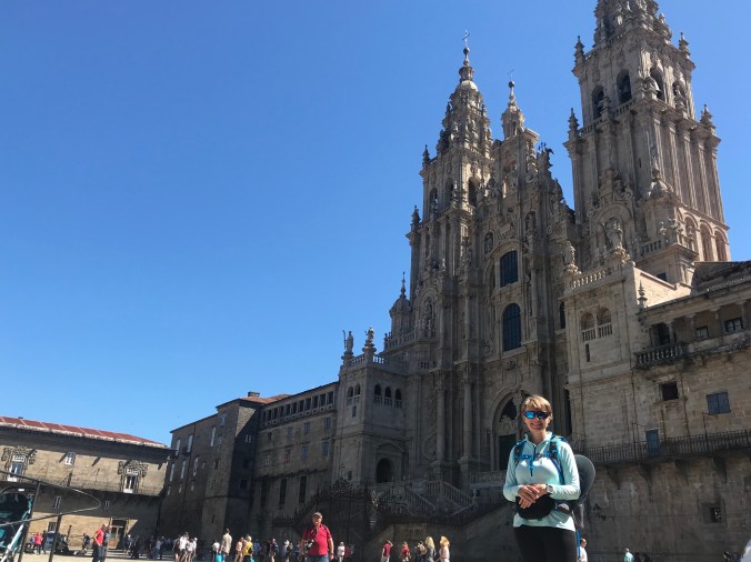 I didn’t really feel a sense of huge accomplishment like others around me as I only walked for two weeks and am continuing on Thursday. The Portuguese is also a more solitary route and I had only a nodding acquaintance with those I did meet. Except who should I see sitting in the middle of the square outside the cathedral? Kelly! She had left at 6am this morning from Padron and must’ve been walking very fast to beat me here.