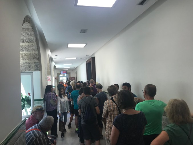 Refreshed, I headed down to the Pilgrim Office to get a last stamp for my credential. Most pilgrims also want a Compostela, a religious certification of completion of their pilgrimage, but that wasn’t of interest to me, and, the line was reputed to be 1.5 hours long!