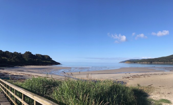 The way drops down to sea level and I walk along a nice boardwalk and flagstone path along the spectacular beach. Those with stronger hips could walk the low tide line while I contented myself with the sturdier way behind the dunes.