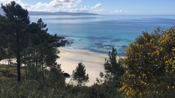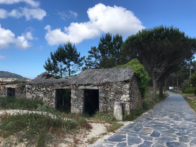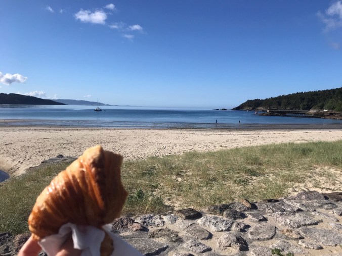 It was a short walk along the coast to Corcubion which was shining prettily in the early morning sun. It just turned 8am and I was lucky on a Sunday to find a cafe just opening, lucky as I’ve only a small bag of nuts on me and I don’t think there’s any stops on the 13 kms between here and Fisterra/Finisterre. The pananderia truck arrived just as I did and brought in nice fresh bread and pastries so I bought a nice, fat croissant “To Go” to see me through the morning.