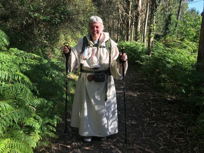 A final little climb into the woods and along a sunny path lined with ferns. I pass a German lady wearing a heavy cotton cassock and trainers. I didn’t ask why but as she was wearing real clothes underneath I thought 1: how hot it must be and 2: how difficult to take a sneaky pee in the woods!