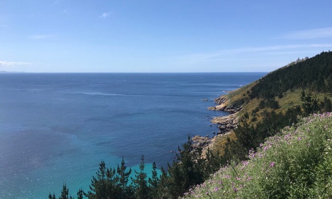9 kms – the path opens to a spectacular vista, the whole Finisterre peninsula is laid out before us and it’s glowing warmly in the morning light. The long walk from town to the lighthouse can be seen to the left.