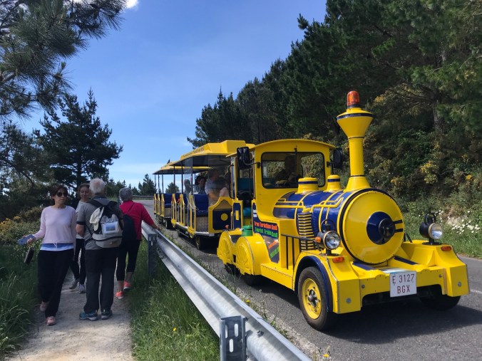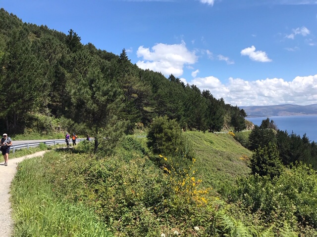 It was a bit hard to find my way through Corcubion, though not all the arrows were hard to miss! This one led thru a very narrow passageway between very high old stone walls which brought me to an extremely steep (what else?) hill into the trees and out of town. It’s a great clear day today and contrary to what to the phone predicted, a very pleasant temperature. I had a nice but extremely stilted conversation in Spanish with these two gentlemen, they’re from Sevilla, just doing the week from Santiago to Fisterra.