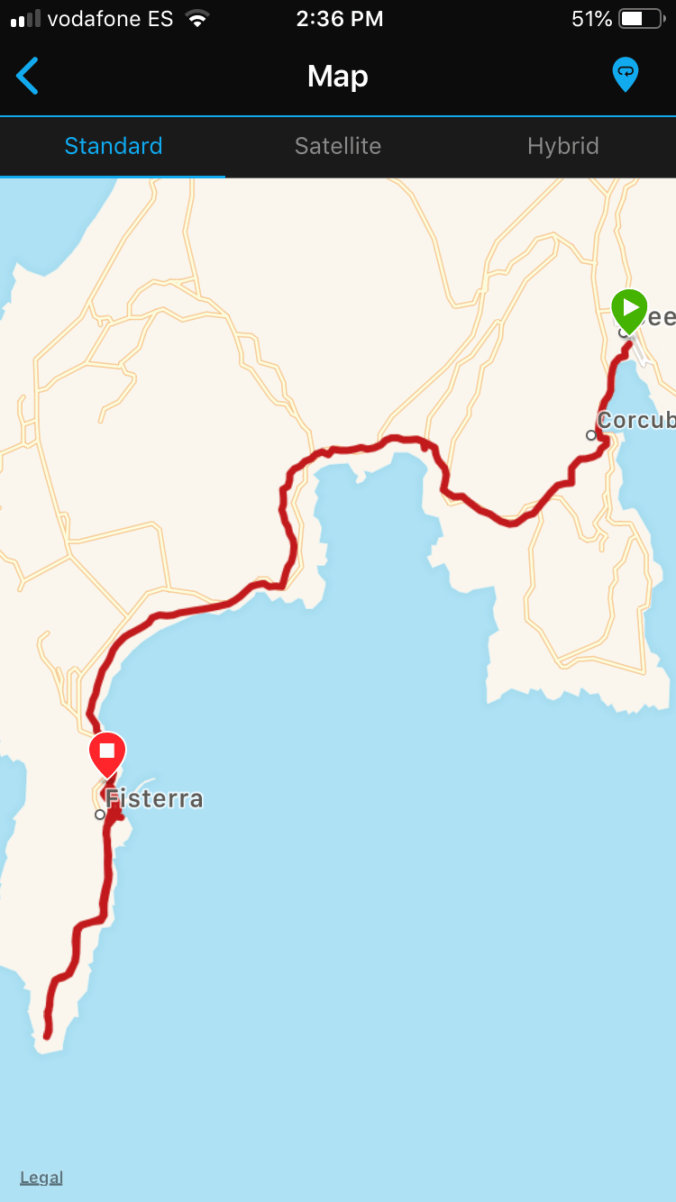 11:20am 13.8 kms I arrived in Fisterra. Checked in to my hotel, had a refreshing beer & tortilla de patatas, then continued on the 3 kms to the lighthouse. Tradition says one should time it to arrive at sunset but that’s really late at night here at this time of year, and then it’d be a long walk back in the dusk, and you can’t take a picture of the lighthouse looking into the sun!