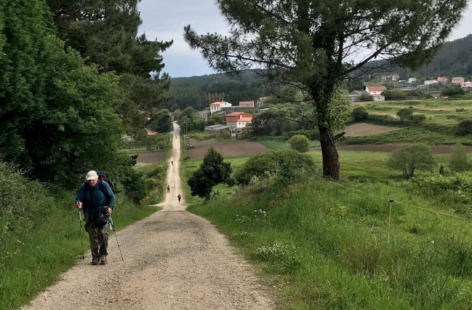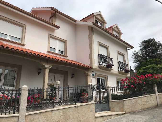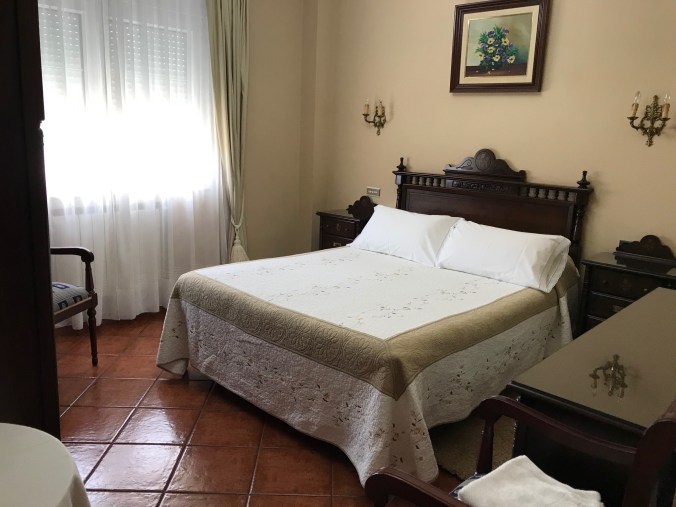 Now the approach to Lires is via an open field and up a paved road lined with several pensíons and rooms-to-let. I’m staying in luxury at a very nice pensíon with beautiful antique-y furniture, I’ll have to be very careful swinging my pack around inside!