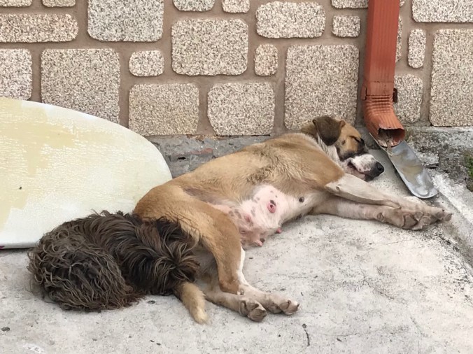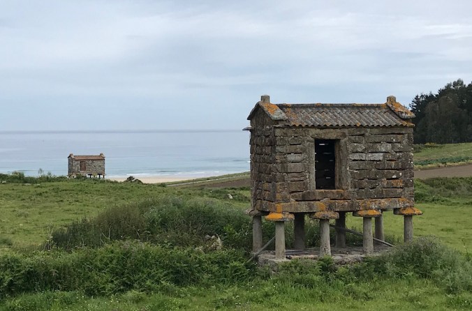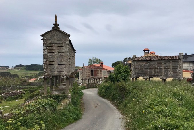 I walk through a couple of hamlets, one just 4-5 homes big with wonderful views of the sea, then back into the forest; then another, larger hamlet complete with lots of hórreos(granaries), ferociously barking German Shepherds and a lumber mill.