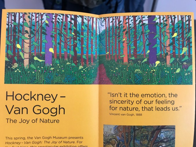 The special exhibit at the V.G. Museum was “Hockney & Van Gogh, The Joy of Nature” which was ending on Sunday. I didn’t know much about Hockney other than his California pool pop art but he’s actually British and returned to Yorkshire to paint it in Spring, eventually staying 9 years, painting all the seasons. Like Van Gogh he felt he saw beauty in the ordinary places in nature and so the museum put on show with some of their work side by side. I took a couple sneaky pics before I realized you weren’t allowed to; I really liked his stuff. Very colorful, very evocative. Some were huge prints of his paintings done on an iPad paint app(!) and they had a video showing of two iPad paintings being created, just like an Etch-O-Sketch. Fascinating.