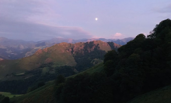 The moon rose over the valley below as the sun set behind us as dinner finished, marking bedtime for all. A good first day!