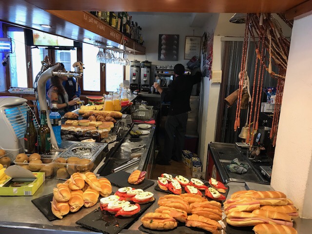 We dipped out into the country for a bit and the temperature dropped dramatically. From 15°C at Roncesvalles it hit 6°C!!! I was freezing! I stopped at the next open bar which happened to be in Espinal and was pleasantly surprised to find a fantastic smorgasbord of breakfast pinchos (plain & chocolate croissants, mini croissants of smoked salmon and ham&cheese, lovely cakes, fresh fruit & juice,etc) and James Brown in full 70’s disco attire playing on the TV!