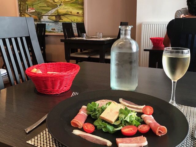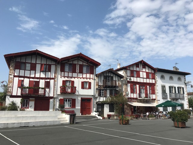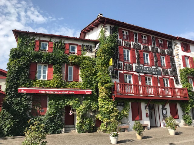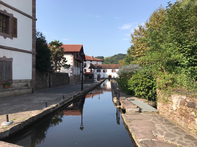 I left my walking partners behind and continued on the Baztan, off-route a bit at first (Esplette is off the Camino) but my apps got me back on track on some dirt roads with some decent elevation but wonderful views. I stopped in Ainhoa for lunch. It’s a pretty town, all red & white, but closed up tight, I believe because Monday’s are quite days but I did find 2 cafes open with of course the $$ one having food. I was a hot and sweaty pilgrim but they still let me sit inside so I had a pleasant light lunch with a glass of wine to fortify me for the last hour or so of walking.
