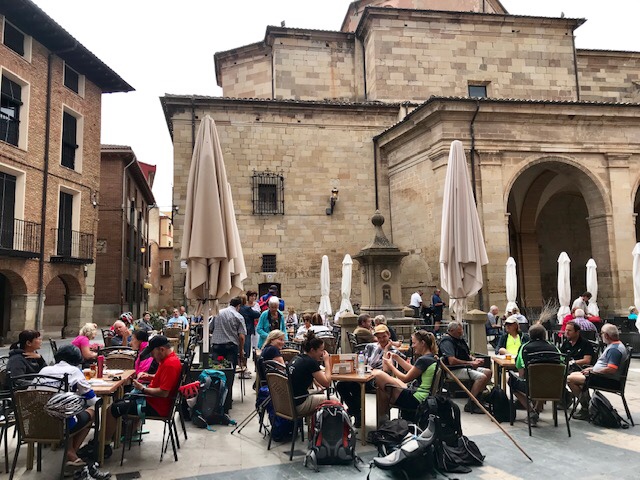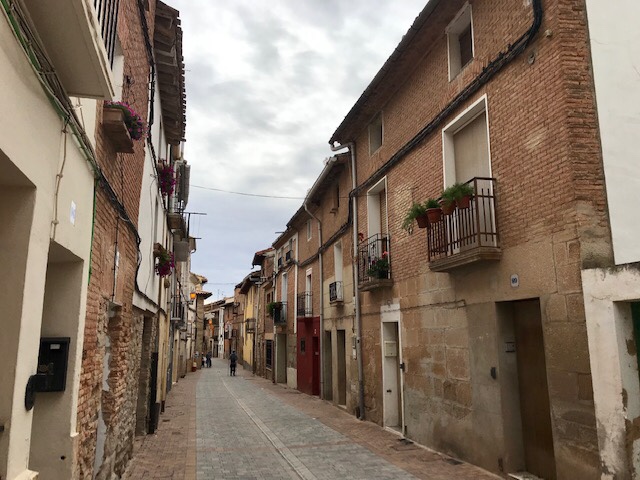 It was 13kms between towns, just lovely country walking with one little rest to enjoy the view and eat a packed sandwich. Descending a hill we walked right into a town, down a long narrow street lined with deserted-looking buildings and homes. I turned a corner and pow: the town plaza and all the pilgrims that have arrived before me seem to have taken over the square. Los Arcos is an End Stage town for many but I’m walking further today as I need a shorter day tomorrow to catch a bus.