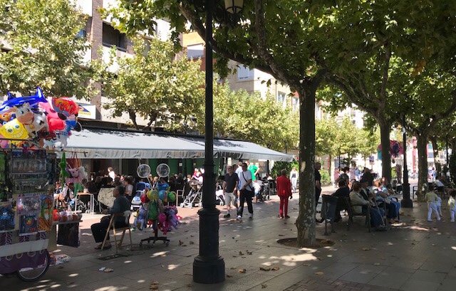 Finally at noon I arrived in Logroño, the end of my walking day. Turns out it must be some fiesta day here as the town is heaving with people. The square outside the cathedral has some kind of free tapas served by guys dressed in all white with red handkerchiefs around their necks and lines of hungry patrons 50+ long wanting their freebie. At the park in the center there’s a stage set up and throngs of people young and old promenading back & forth. All this action is a bit overwhelming for a poor peregrina who’s now used to backroads and tiny villages.