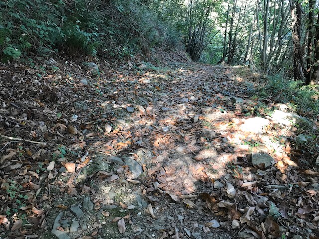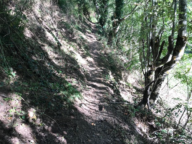 UP and DOWN and UP and DOWN… The deviation through woods was much preferable to 16kms of tarmac walking but jeez! When transversing a hillside with paths sometimes only a foot wide is it really necessary to throw in just vicious ascents and descents? My sanity was saved by the parts when the trail opened wide to old reveal ancient cobblestones covered in a thick layer of golden leaves that I happily scuffled my way through.