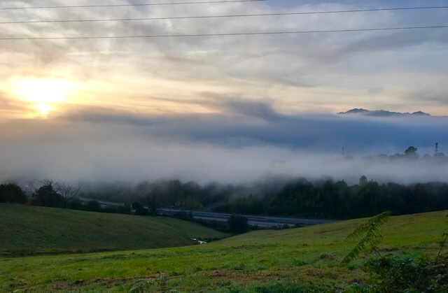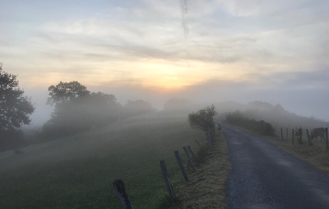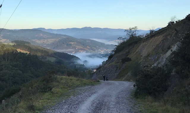 Dawn just beginning as I left town, it’s warmth bringing mist down from the hills and thick fingers of fog in from the east. The Camino started to climb immediately, and the mist seemed to be chasing me up the hill.